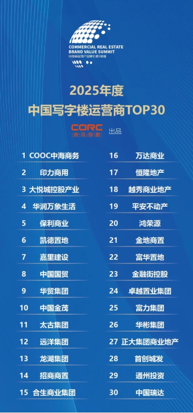 以下为2025年度中国写字楼运营商TOP30研究成果: