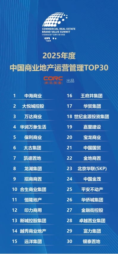 以下为2025年度中国商业地产运营管理TOP30研究成果:
