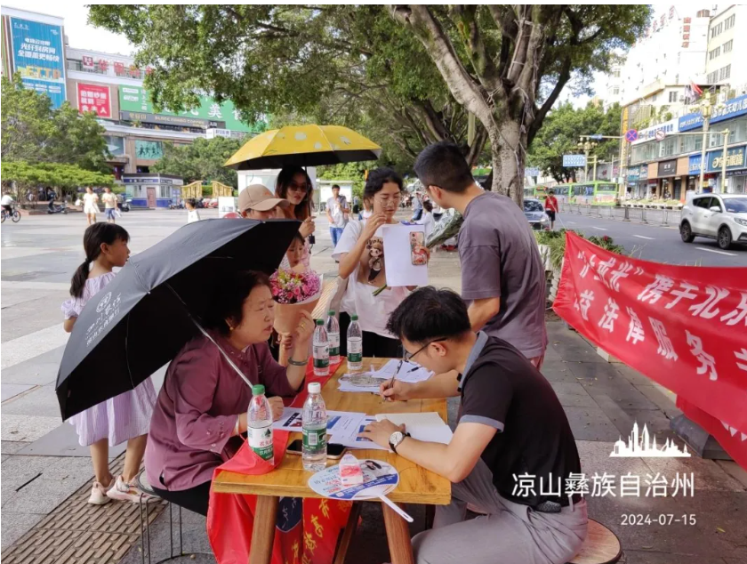 7月15日,公益团队在西昌市人流量最大的月城广场设立了咨询点。炎炎夏日,团队成员们不畏酷暑,分头行动,一边定点提供法律咨询服务,一边走访咨询,确保每一位需要帮助的彝族同胞都能得到及时的法律支持。