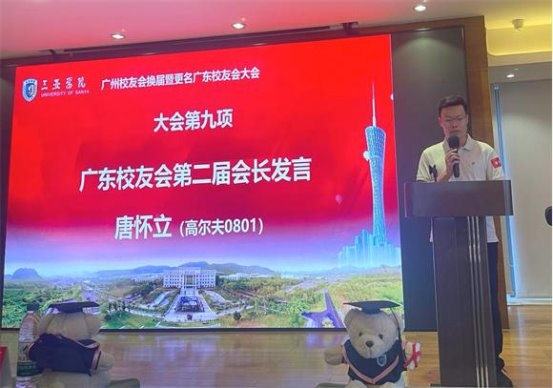 第二届广东校友会会长唐怀立(高尔夫 0801)上台分享了未来规划,他表示,我们会定期组织校友联谊、资源对接、母校回访活动,通过搭建 " 广东校友信息数据库 ",打破地域与行业的壁垒,提升广东各地校友沟通频次,拓展交流合作深度,让校友联结更紧密,服务更贴心,并努力将广东校友会建设成为大家的温馨家园与合作平台。